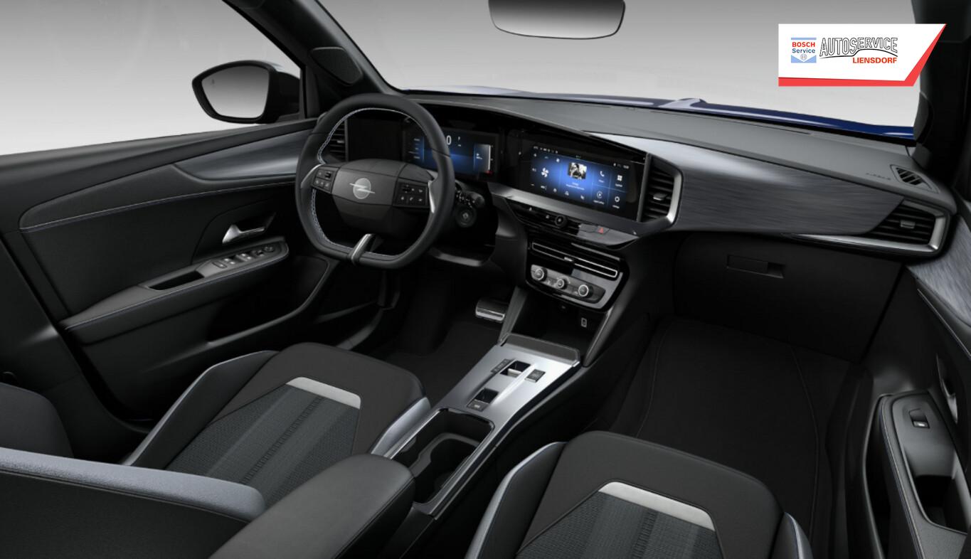 Komfort-Paket (Gepäck-/Laderaumboden doppelt / Innenspiegel rahmenlos mit Abblendautomatik / Lenkrad heizbar / Sonnenblenden mit Spiegel (beleuchtet) / Sitzheizung vorn / Lenkrad (Leder, vegan) mit Multifunktion), 10"-Touchscreen, 2 USB-Ladeschnittstellen an der Mittelarmlehne, hinten, Außenspiegel elektr. verstell- und heizbar, Fahrassistenz-System: Fußgängererkennung, Fahrassistenz-System: Spurhalteassistent, Geschwindigkeits-Begrenzeranlage, Geschwindigkeits-Regelanlage (Tempomat), Kombiinstrument digital (10"), LM-Felgen 6,5x17, Mittelarmlehne vorn, Reifen 215/60 R17, Schadstoffarm nach Abgasnorm Euro 6e (EU6 EA), Scheinwerfer Eco-LED, Audiosystem Multimedia (6 Lautsprecher / Smartphone Schnittstelle (Apple CarPlay & Android Auto)), Black-Paket (Dach, Design-Ausführung (schwarz) / Kühlergrill, Opel Vizor, Rahmen in Hochglanz-Schwarz / Schriftzug Heckklappe Schwarz, Hochglanz), Sicht-Paket (Innenspiegel mit Abblendautomatik / Einschaltautomatik für Fahrlicht mit Tunnelerkennung / Scheibenwischer mit Regensensor), Parkpilotsystem hinten (Rückfahrkamera mit 180° Umgebungsansicht), Dach Kontrast-Lackierung, Fahrzeugschlüssel (2) beide klappbar, Karosserie: 5-türig, Mild-Hybrid 107 kW (Motor 1,2 Ltr. - 100 kW), Radstand 2557 mm, Anti-Blockier-System (ABS), Antriebsart: Frontantrieb, Elektron. Stabilitäts-Programm Plus (ESP), LM-Felgen 6,5x17 (5-Doppelspeichen, Bicolor), Getriebe Automatik - Doppelkupplungsgetriebe (6-Stufen, Hybrid), Klimaautomatik, Sitzbezug / Polsterung: Stoff / Ledernachbildung, Wärmeschutzverglasung hinten abgedunkelt (Solar-Protect), Fahrassistenz-System: Verkehrszeichenerkennung, Fahrassistenz-System: Fernlichtassistent, Heckleuchten LED, Tagfahrlicht LED, Fahrassistenz-System: Müdigkeitserkennungs-Sensor
